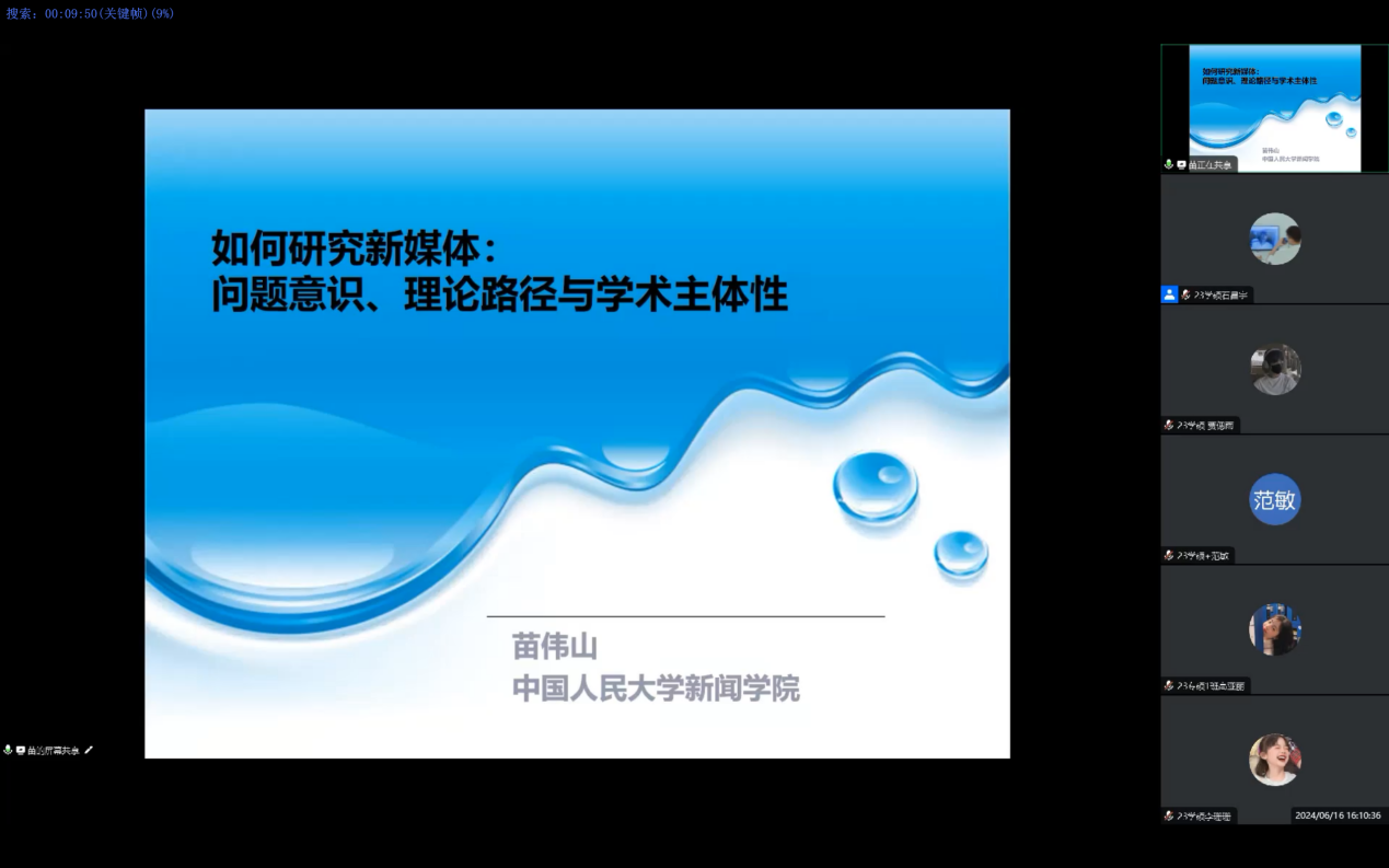 6月16日下午16:00,新闻与传播学院邀请中国人民大学新闻学院副教授苗伟山主讲《新媒体研究:案例与方法》。讲座由李宏刚副院长主持,学院部分教师代表和硕士研究生积极参与。苗伟山副教授以其深厚的学术背景和丰富的实践经验,为大家带来了一场关于新媒体研究的前沿分享。