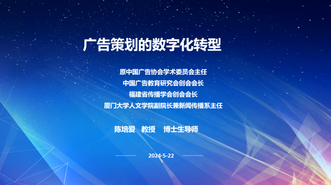 5月22日17时40分,新疆大学新闻与传播学院第29期新新讲坛专题学术讲座在红湖校区12号楼115教室举办,邀请厦门大学陈培爱教授做了题为“广告策划的数字化转型”的专题学术讲座,新闻与传播学院共有90余名师生听取了此次讲座。