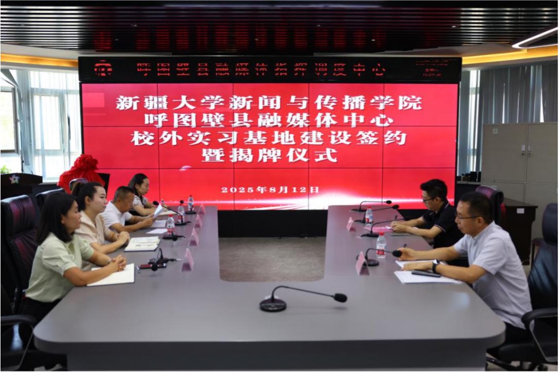 8月12日上午,新闻与传播学院和呼图壁县融媒体中心校外实习基地建设签约仪式暨座谈交流会在呼图壁县融媒体中心举行。新闻与传播学院党委委员、副院长杜松平,呼图壁县委宣传部副部长田晓梅,呼图壁县融媒体中心党支部书记、主任霍卫东,呼图壁县融媒体中心总编辑马慧,新闻与传播学院新闻系系主任武运波、呼图壁县融媒体中心副主任刘瑞雪以及各科室主任及业务骨干,出席签约仪式。