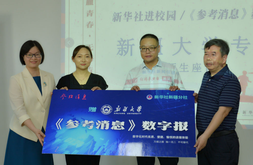 活动现场,新华社新疆分社和参考消息报社联合向新疆大学师生赠阅新华社重点报刊《参考消息》数字报1000份。