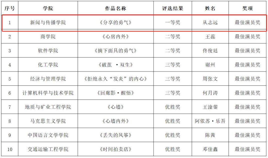 4月18日,由党委学生工作部主办的新疆大学第二十二届“‘剧’焦心灵,情暖校园”心理情景剧决赛在博达校区大学生活动中心落下帷幕。自活动启动以来,新闻与传播学院师生积极参与,精心创作。学院推荐的心理情景剧《分享的勇气》经过层层选拔,在全校30个作品中脱颖而出,成功晋级决赛,并荣获一等奖佳绩,新传24-3班从志远同学荣获最佳演员奖。